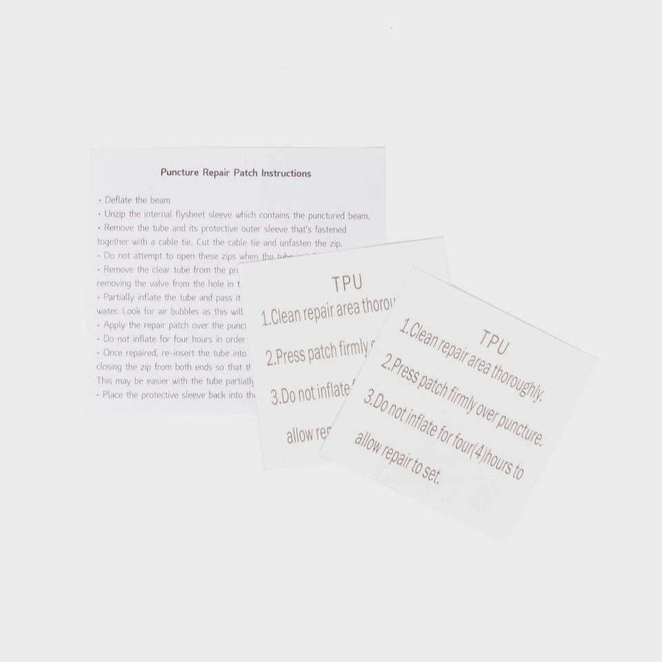 Replacement puncture repair patches for inflatable tents. Easy to use and very reliable. For use in the field.
